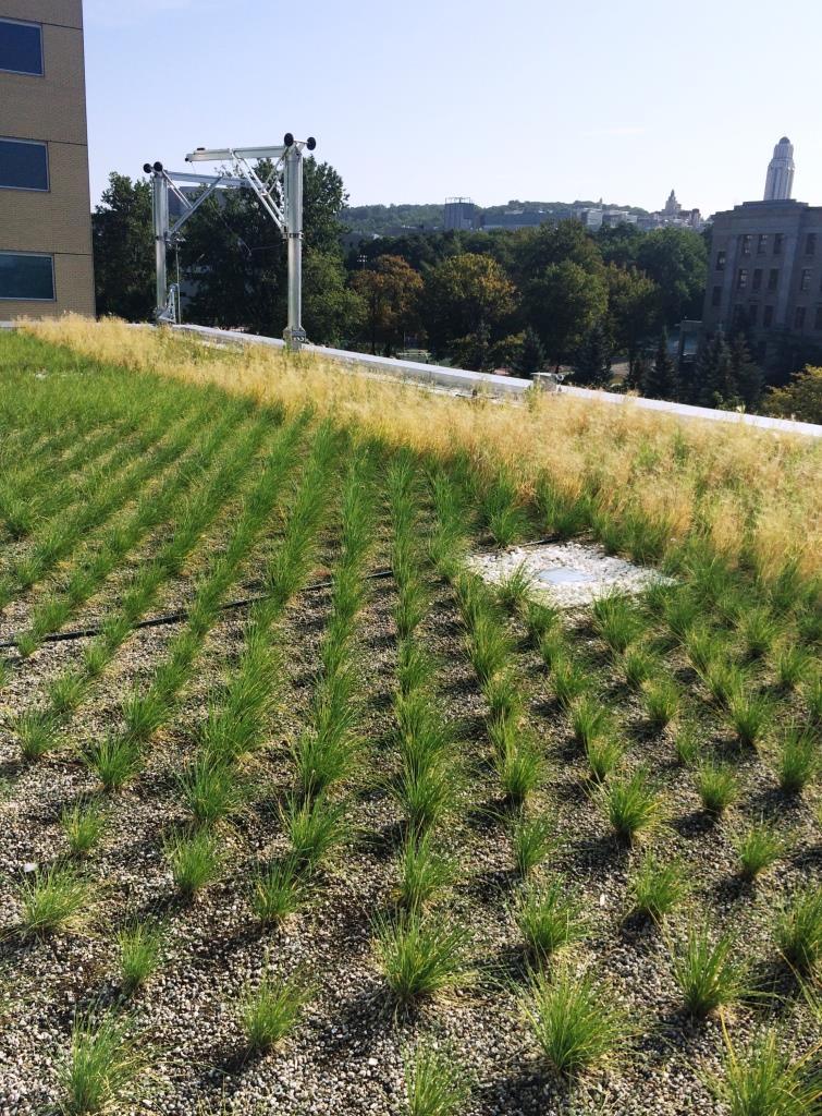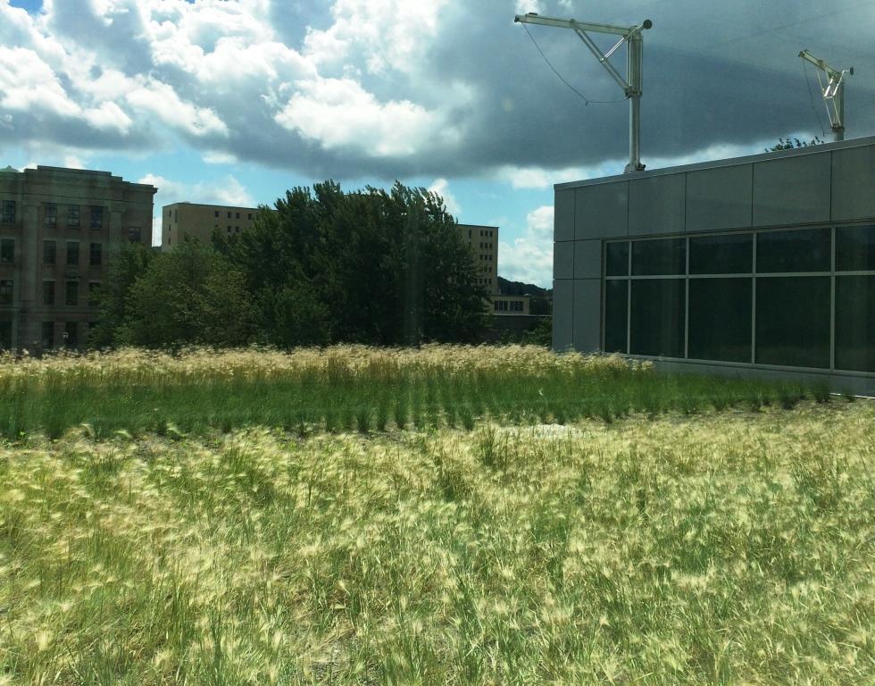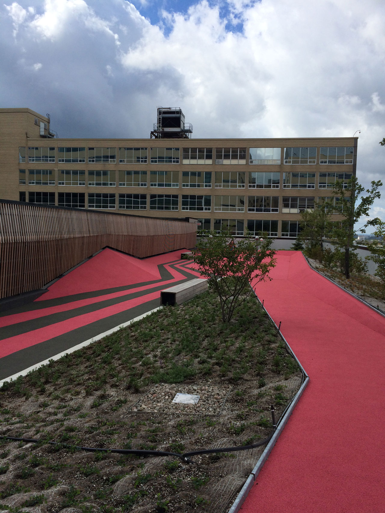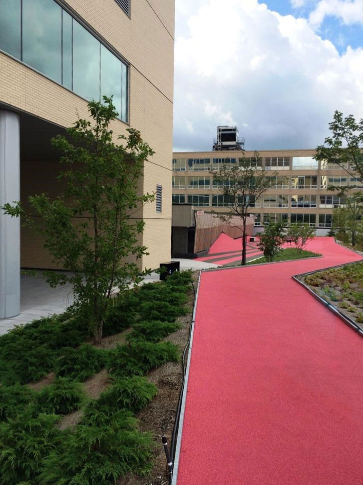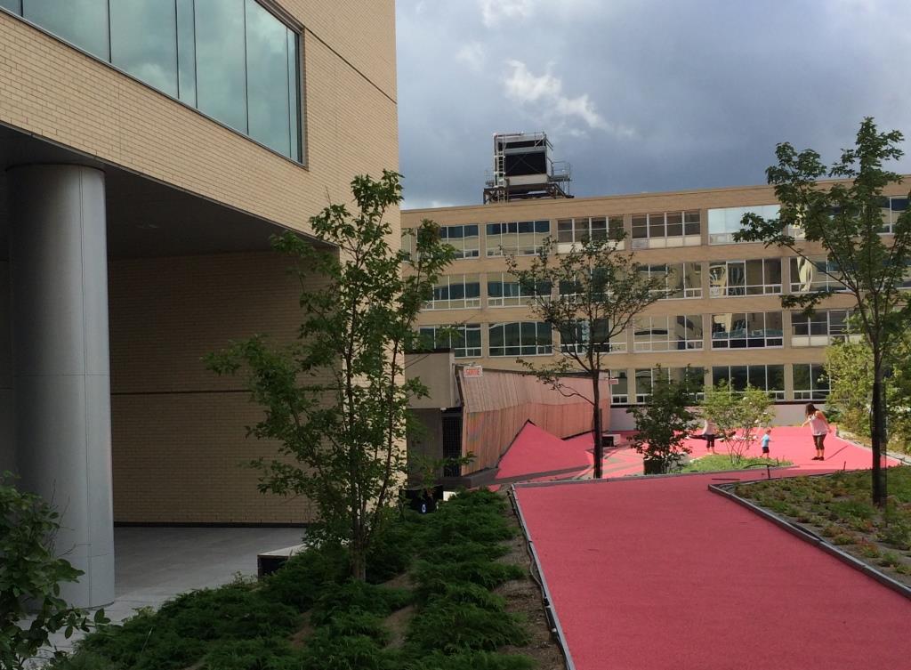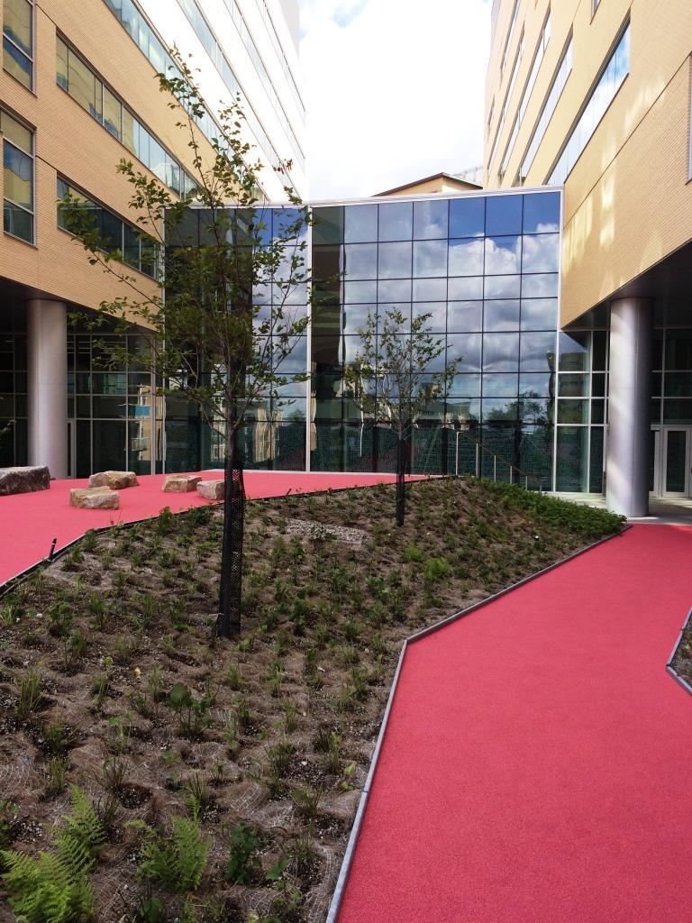 The CHU building features Extensive garden roofs on several levels. There are two accessible courtyards, a large vegetated esplanade with a pedestrian crossing, and play areas for children.