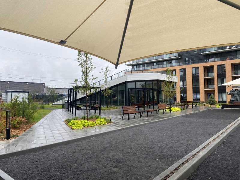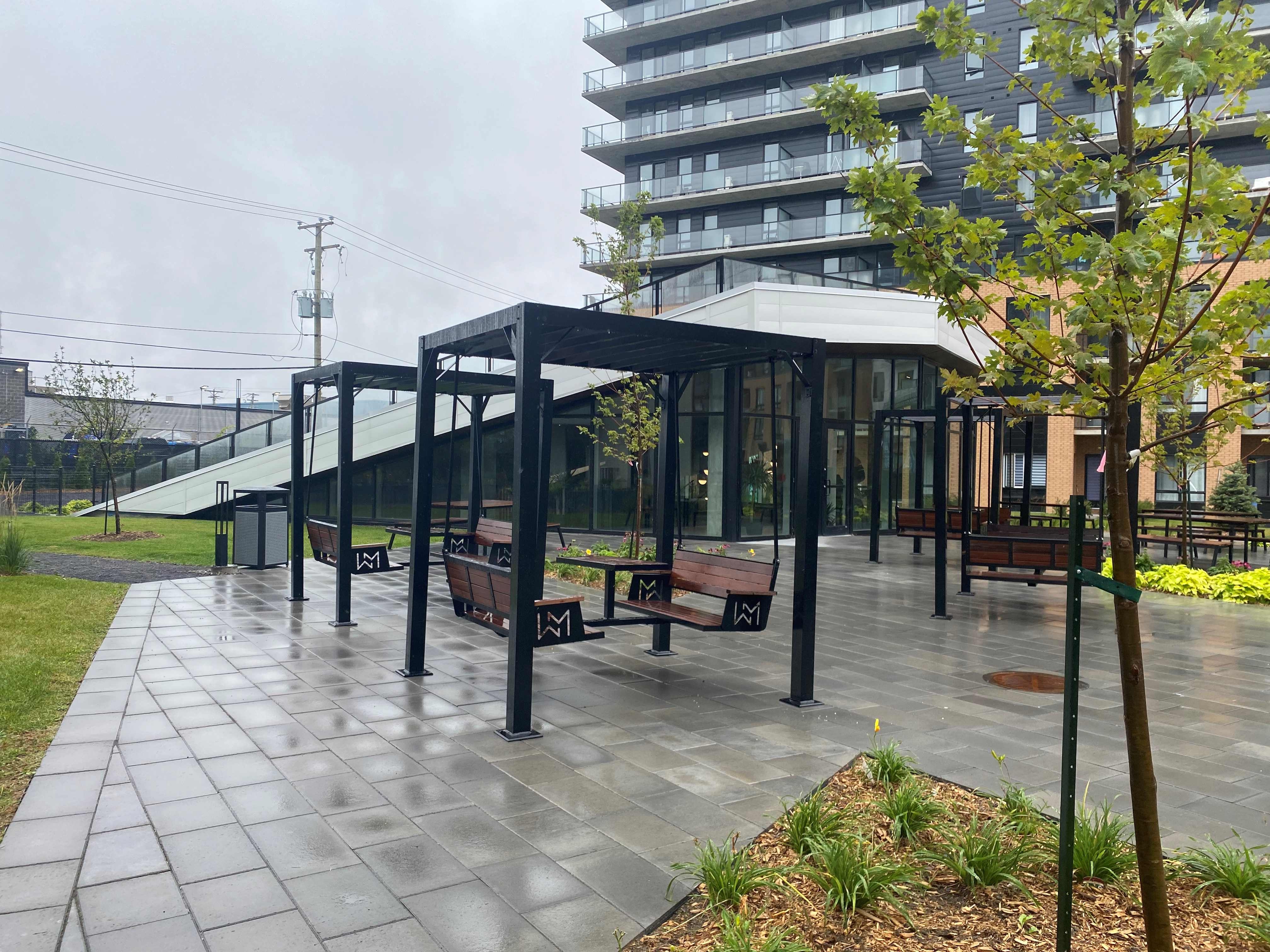 This building project was developed on Rue Léger, at the junction of Boulevard Newman in Lasalle, Montreal. In the middle of the residential units stands the shared interior courtyard with its garden pavilion. The pavilion's vegetated roof is a slow outdoor ascent that can be climbed to sit atop and rest, while admiring the result of the choice to vegetate with Hydrotech® InstaGreen® Carpet. It's thanks to the Hydrotech® GardNet® soil containment system that the vegetation stays in place without any worries about material slippage.