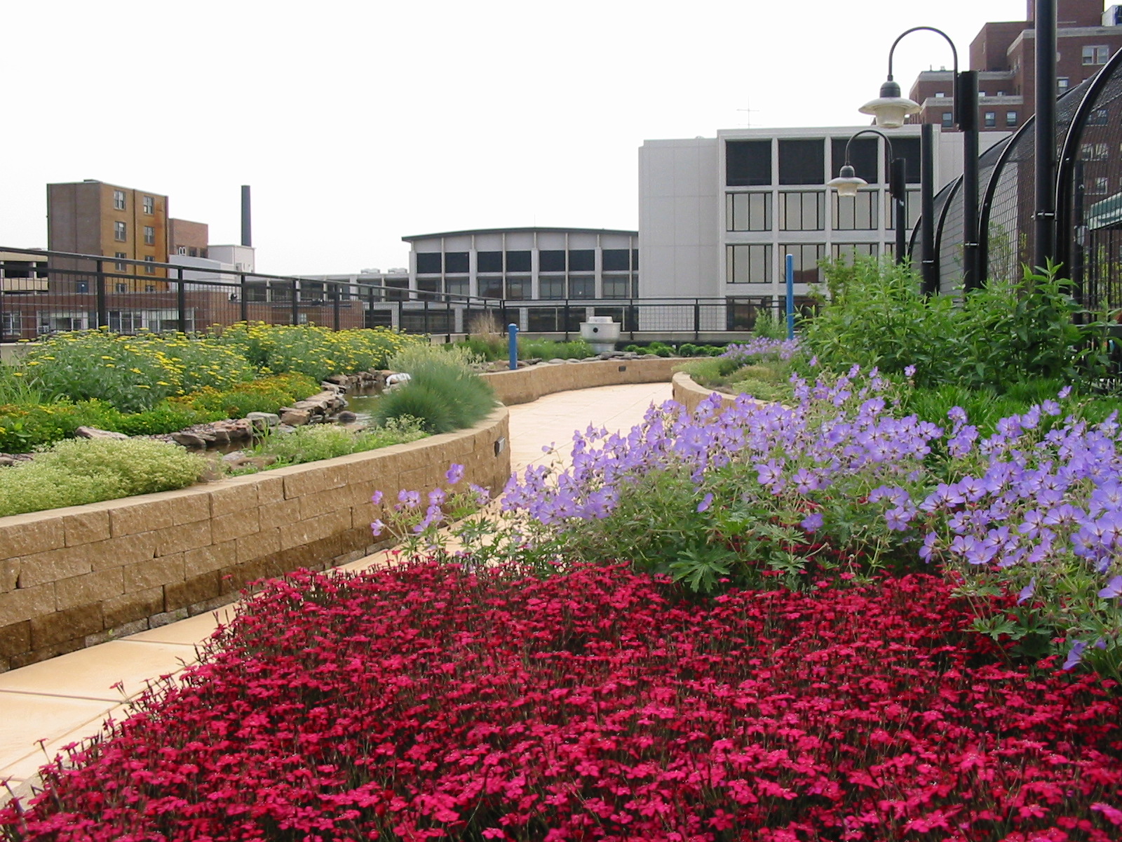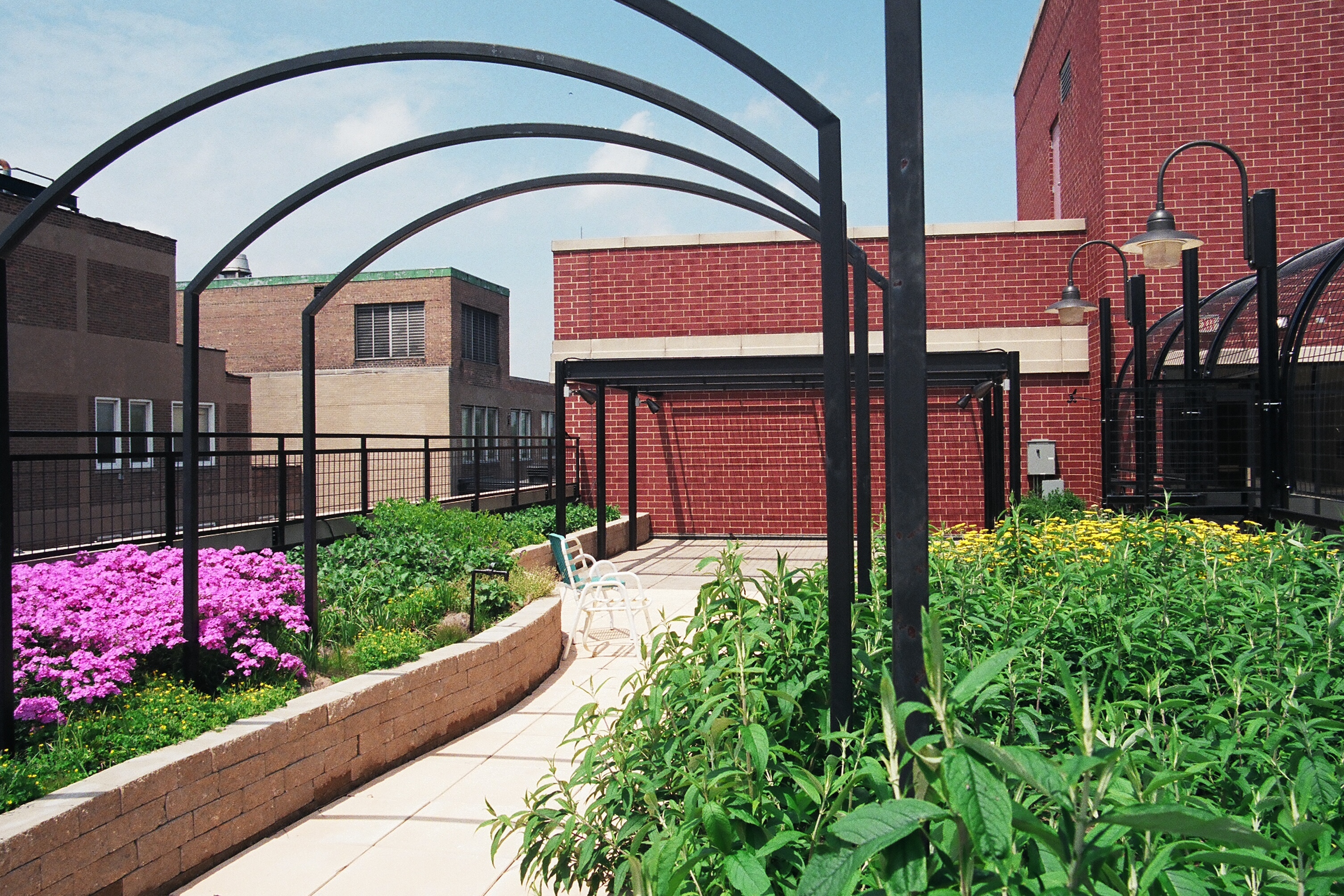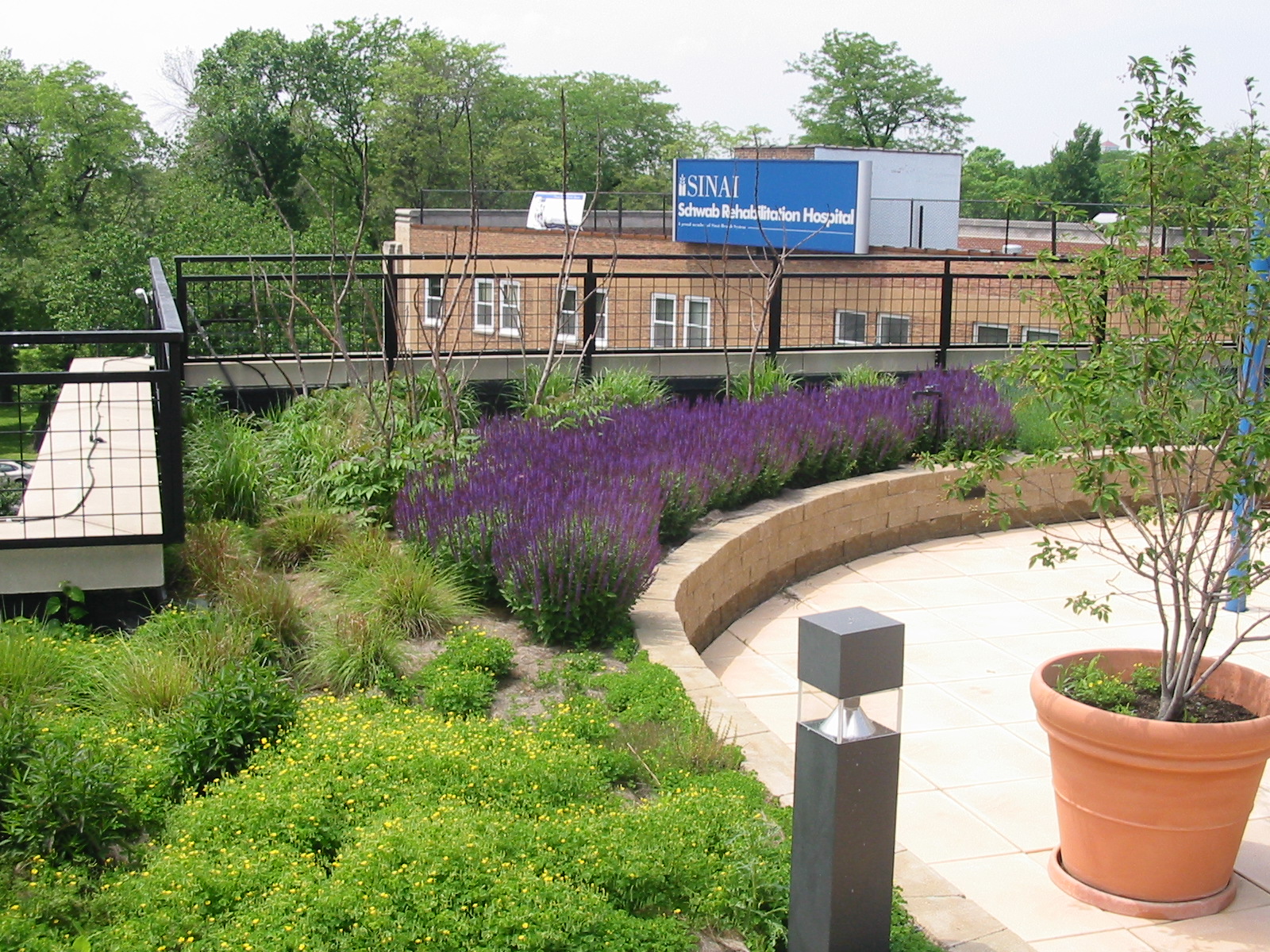 In 2001, Schwab contracted landscape architecture firm Douglas Hills Associates, Inc. to prepare a concept master plan for a therapeutic rooftop garden. Because the hospital was also in the final stage of an adjacent $23 million, multi-phased building addition/renovation project, little funds were available. Through activism initiated by the landscape architect, a lush garden on Schwab’s rooftop was made a reality. The firm discovered special opportunities were available through the City of Chicago’s Department of the Environment, which was issuing green roof grants under its Urban Heat Island Reduction Initiative; from which the hospital received a $400,000 grant.