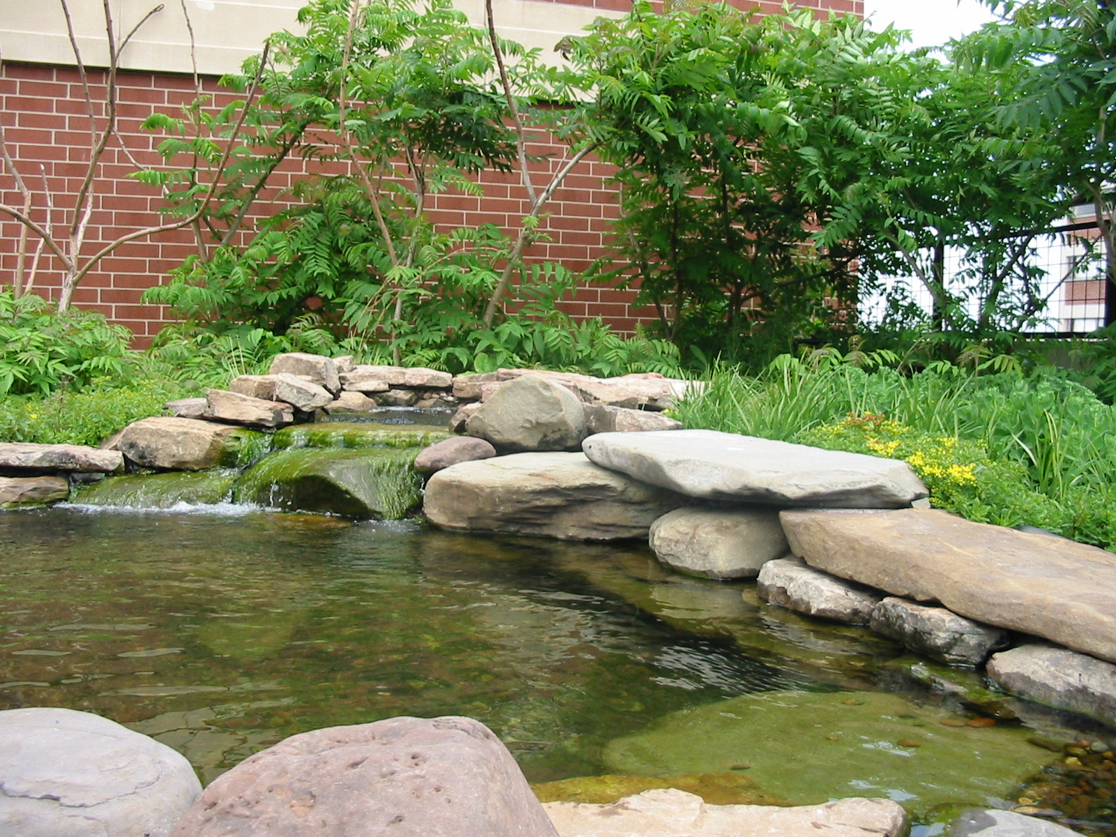The rooftop also incorporates a waterfall garden, a 60 ft. stream, overhead shade pergola, large planters with ornamental trees and raised beds for vegetables and herbs.